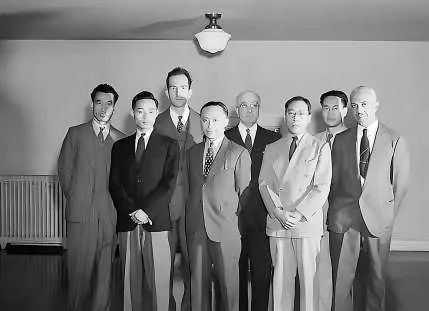 上世纪四十年代,美国国会图书馆东方部主要馆员合影,左一为王重民、左四吴光清、左五为恒慕义。