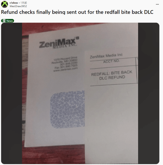 Reddit网友WestDraw3952发帖称,在Bite Back DLC取消一年后,他终于收到了一张实体支票形式的退款。评论区有玩家表示最近也刚收到邮寄的支票。
