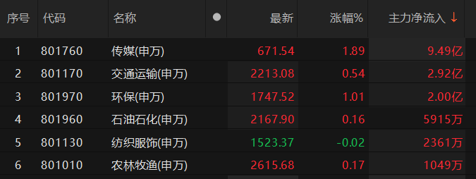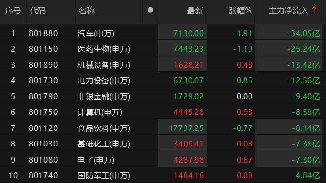 截至5月26日13时57分,申万一级行业板块中,主力资金净流入传媒、交通运输、环保等板块,其中,传媒板块净流入超9亿元。主力资金净流出汽车、医药生物、机械设备等板块,其中,汽车板块净流出超34亿元。